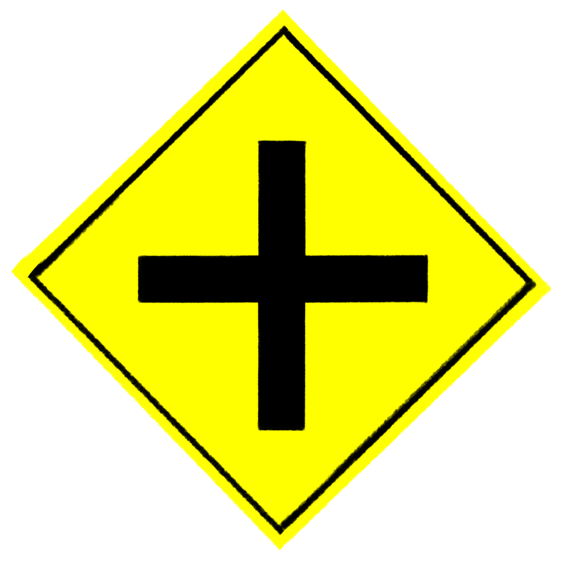 十字路(交差点)を示す黄色い警戒標識のイラストです。道路・交通・ナビ・地図などの素材として使えます。商用利用無料でダウンロードできます。