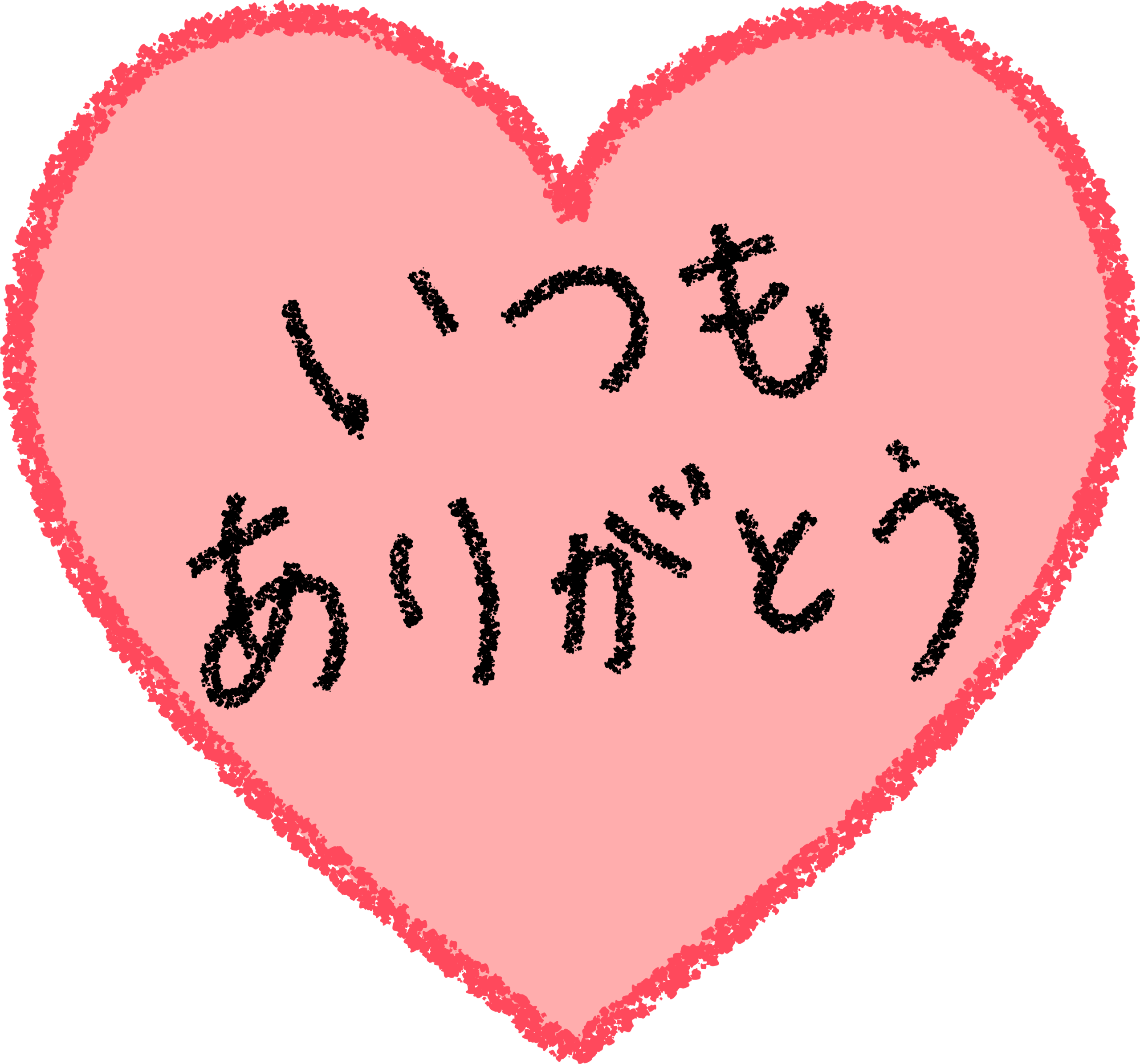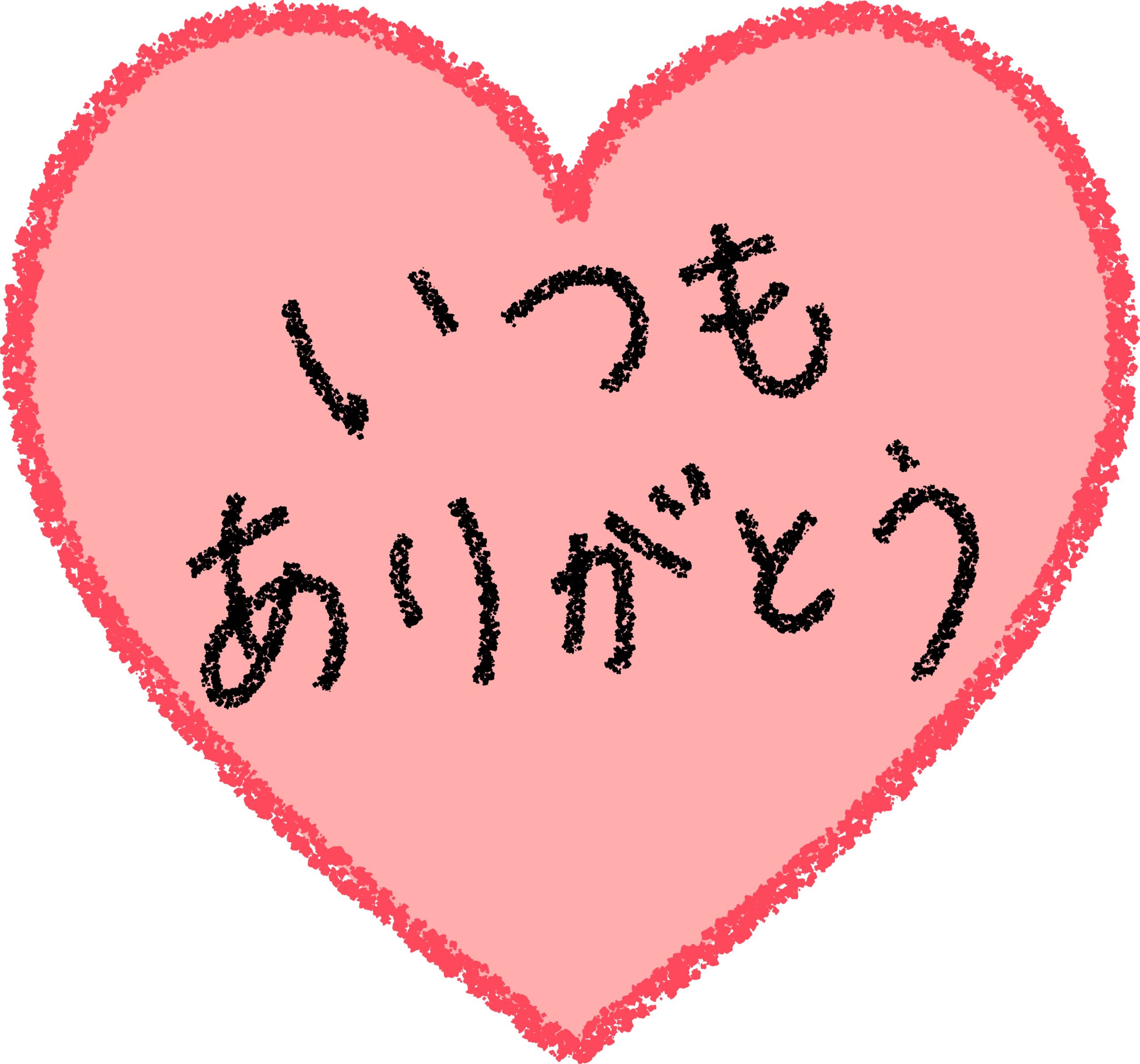 書きクレヨン風のピンクのハートに「いつもありがとう」と書いたフリーイラストです。
