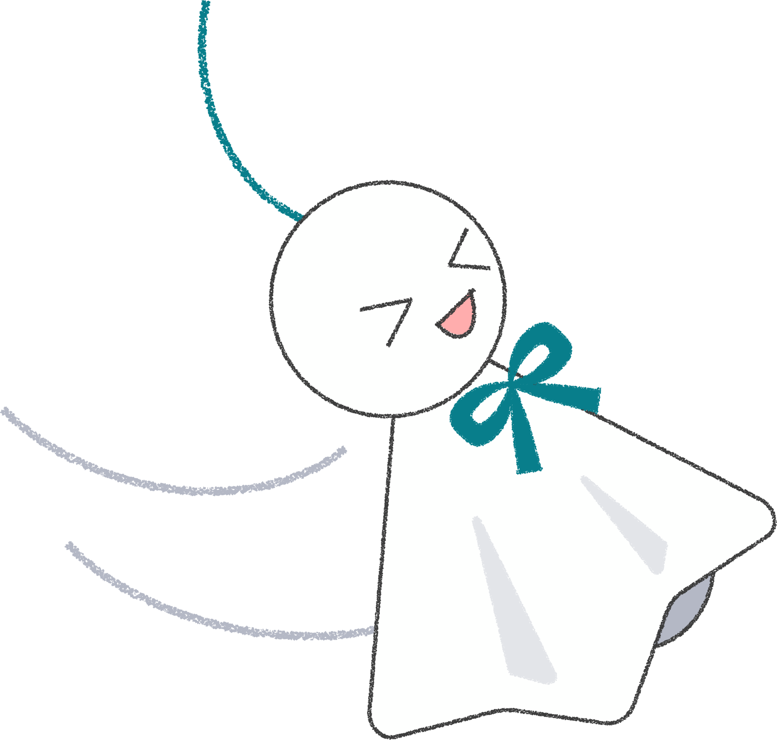 風にゆらゆら揺れながら笑っているてるてる坊主(青リボン)のフリーイラストです。